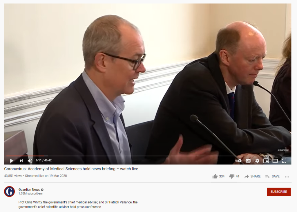 We broadcast to the nation at the start of the COVID-19 pandemic through our press conference with the Science Media Centre. This gave health and science journalists access to Professor Chris Whitty and Sir Patrick Vallance and was streamed live on BBC, Sky and more. The full briefing is available to watch below. (19 March 2020) and was filmed in the John Newson Davis Suite.